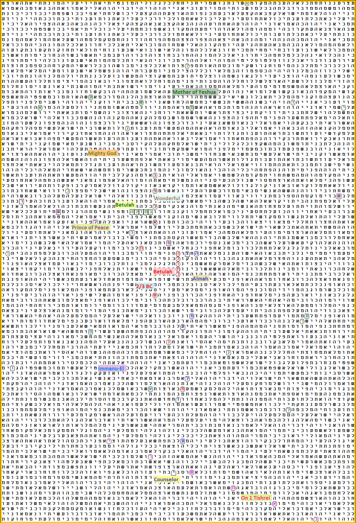 Now let’s look at a Bible code using “betulah” as the primary search term. In this matrix, we also have almah; on Tishrei 1 (Yeshua’s birthday); 2/3 BC (year of His birth); Wonderful; Counselor; Mighty God; Prince of Peace; Immanu-El; and mother of Yeshua. I believe this matrix shows Yeshua was not only born of a virgin but also of an almah. It also suggests He is the fulfillment of the promised child of Isaiah 9:6. Click these to enlarge. Be sure to click a second time on the matrix.