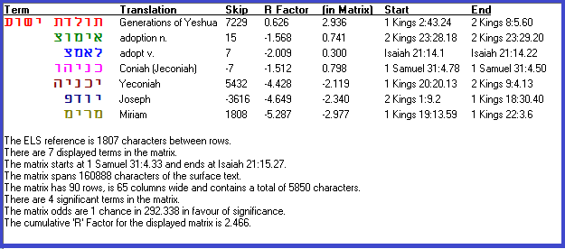 See the following Bible code matrix and report. The primary search term is “Generations (Genealogy) of Yeshua.” The matrix was found using this term. “Yeconiah” and “Joseph” both cross this primary search term while “Miriam” is very close by and in parallel with “Joseph.” The words “adoption” and “adopt,” as well as the name “Coniah” appear in the matrix. The statistics and location of the code are found in the report. Click to enlarge. You will need to click one more time on the matrix when it comes up.