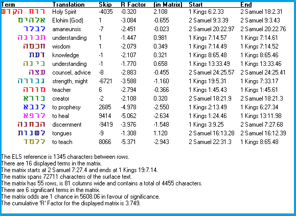 The last matrix is for the Holy Spirit, which is the primary search term. Some of the matching terms include: discernment, Creator, Teacher, Counselor, God, tongues, to prophesy, etc. But most important for us, it includes the term for “scribe (amanuensis).” According to the Webster’s dictionary, amanuensis means one employed to write from dictation or to copy a manuscript. Why would the Holy Spirit have this term as a thematic characteristic? I could be wrong; but, I wonder if it’s because when the amanuensis entered Miriam to cause conception, it was writing or creating the proper genetic code for Yeshua. It’s as if the scribe wrote/created the Word that would become flesh. Be sure to click twice, pausing in between clicks to fully enlarge: