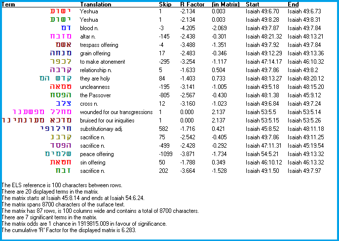 Do you question that Yeshua was a substitutionary sacrifice? Did He really fulfill the Levitical sacrifices? Check out this Bible code and corresponding report. Click TWICE (pause between clicks) to fully enlarge. Last edited 9/2/15.